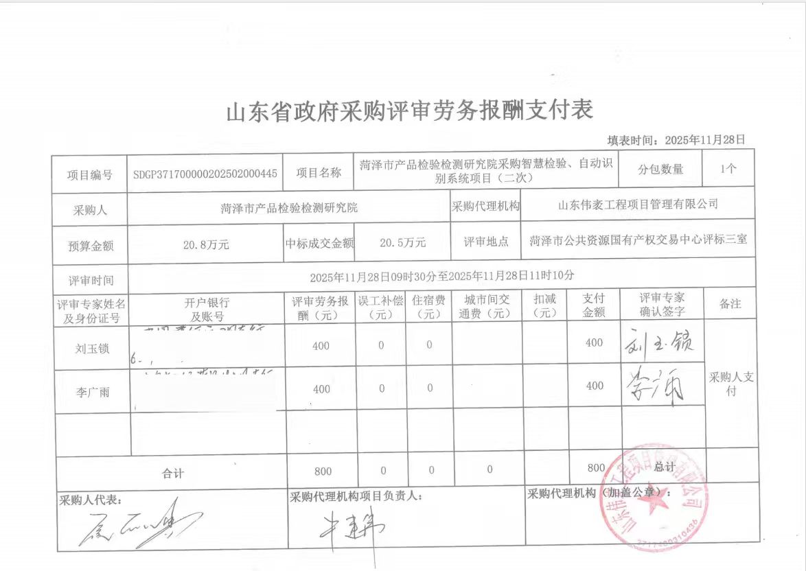 菏泽市产品检验检测研究院采购智慧检验、自动识别系统项目 中标(成交)结果公告 一、项目编号:SDGP************00445 二、项目名称:菏泽市产品检验检测研究院采购智慧检验、自动识别系统项目 三、中标(成交)信息: 标包:A ******有限公司 供应商地址:山东省济南市历城区花园路鑫苑花园公馆1号楼1单元6楼621-02室 中标(成交)金额:(可填写下浮率、折扣率或费率):205000.00元 四、主要标的信息: 标包:A 名称:菏泽市产品检验检测研究院采购智慧检验、自动识别系统项目 品牌(如有):详见文件 规格型号:详见文件 数量:详见文件 单价:详见文件 五、评审专家(单一来源采购人员)名单:标包A:刘玉锁、李广雨、侯仰博 标包************有限公司(85.85、82.35、81.35) 六、代理服务收费标准及金额: 收费标准:详见文件 收费金额(单位:元):3000.00 七、公告期限 自本公告发布之日起1个工作日。 八、其他补充事宜: 其他补充事宜:无 九、未中标(成交)供应商的未中标(成交)原因: ******有限公司:综合评审得分较低; ******有限公司:综合评审得分较低; 十、凡对本次公告内容提出询问,请按以下方式联系: 1.采购人信息 名称:菏泽市产品检验检测研究院 地址:菏泽市郑州路888号 联系方式:张主任 ****** 2.采购代理机构信息 ******有限公司 地址:菏泽市中华路与桂陵路交叉口金角大厦17楼 联系方式:牛经理 ****** 3.项目联系方式 ******有限公司 电话:******