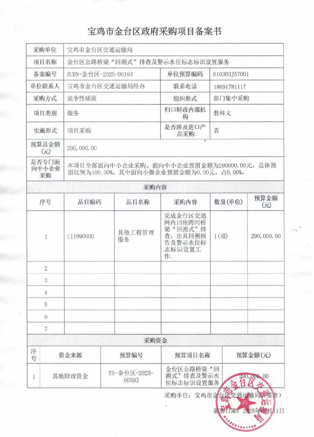 宝鸡市金台区交通运输局金台区公路桥梁“回溯式”排查及警示水位标志标识设置服务中标(成交)明细.pdf 磋商文件9.19.rar 备案表.jpg 中小企业声明函.pdf